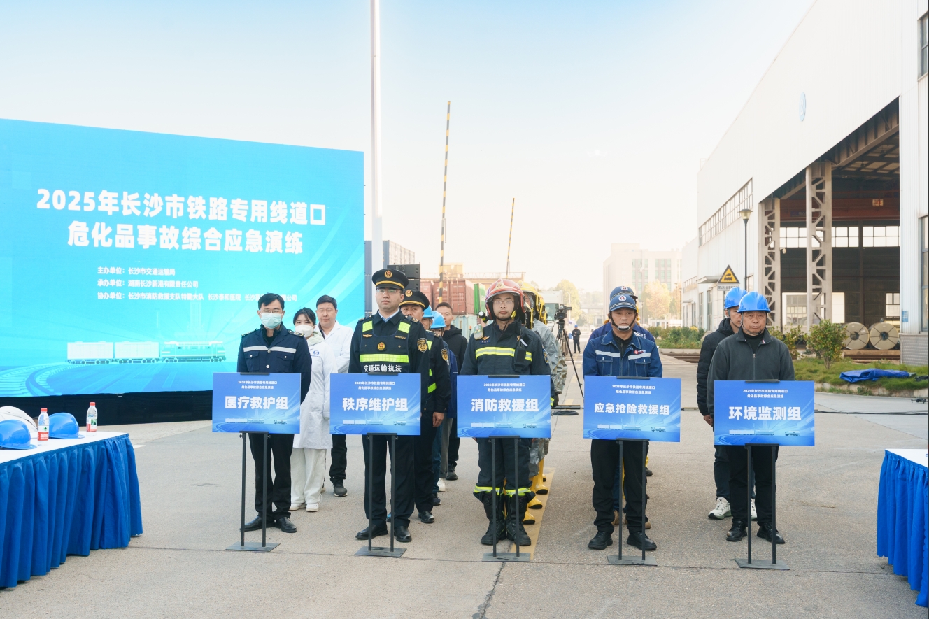 11月21日,2025年長(zhǎng)沙市鐵路專用線道口危化品事故綜合應(yīng)急演練在長(zhǎng)沙新港公司舉行,演練由長(zhǎng)沙市交通運(yùn)輸局主辦,長(zhǎng)沙新港公司承辦,長(zhǎng)沙市市生態(tài)環(huán)境局、開(kāi)福區(qū)消防救援大隊(duì)、長(zhǎng)沙泰和醫(yī)院參加。 演練模擬一輛裝有甲醇二甲胺的危化品槽罐車經(jīng)過(guò)鐵路道口時(shí),因雨天路滑發(fā)生事故,導(dǎo)致裝載物泄露,一名司乘人員被困車內(nèi),一列火車即將通過(guò)道口,情況十分危急。道口值班人員發(fā)現(xiàn)事故后,第一時(shí)間通知車站信號(hào)樓,并緊急采用手旗信號(hào)截停列車,避免發(fā)生二次事故并造成更嚴(yán)重的后果,同時(shí),值班員迅速向長(zhǎng)沙新港公司報(bào)告事故情況,包括泄漏罐車的位置、泄漏程度、是否有起火、人員受困或傷亡等信息,長(zhǎng)沙新港公司迅速啟動(dòng)應(yīng)急預(yù)案。應(yīng)急救援、警戒疏散等多個(gè)小組攜帶裝備5分鐘內(nèi)集結(jié)完畢,奔赴事故現(xiàn)場(chǎng)處置。隨后,消防救援人員、醫(yī)療救護(hù)人員、環(huán)境監(jiān)測(cè)人員等各司其職,聯(lián)合處置了這一起突發(fā)事件。