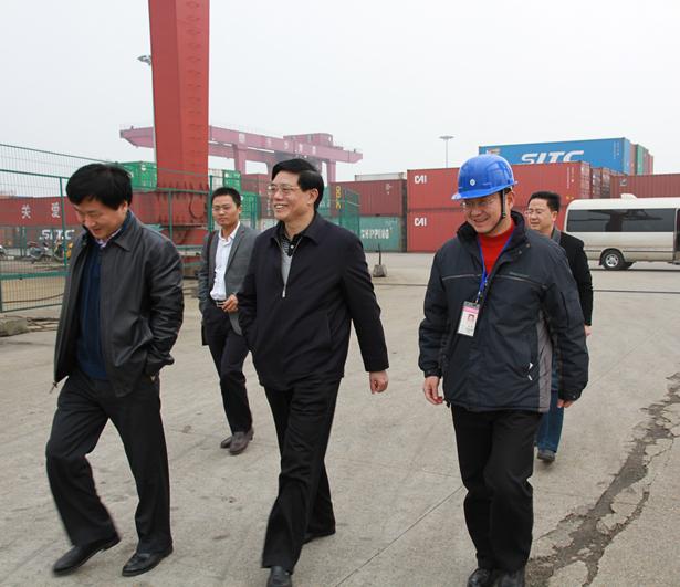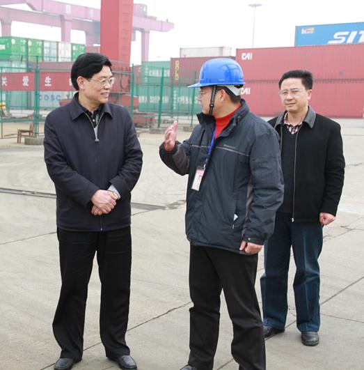 2月28日,湖南省委副秘書長、省委政策研究室主任賀安杰等領(lǐng)導一行來長沙新港考察調(diào)研。湖南長沙新港有限責任公司董事、長沙集星集裝箱碼頭有限公司副總經(jīng)理辛華,新港公司辦公室主任王偉宏接待。 在集裝箱碼頭上,公司領(lǐng)導辛華向省領(lǐng)導一行詳細介紹了長沙新港一、二期工程建設規(guī)模及運營情況,匯報了新港三期工程建設的進展以及目前存在如港口功能不配套、企業(yè)資金不足、湘江長沙綜合樞紐建成后對港口的影響等情況。賀秘書長強調(diào),長沙新港三期工程建成后,港口的功能將更加完善,有利于更好地服務湖南省外向經(jīng)濟發(fā)展。 |
