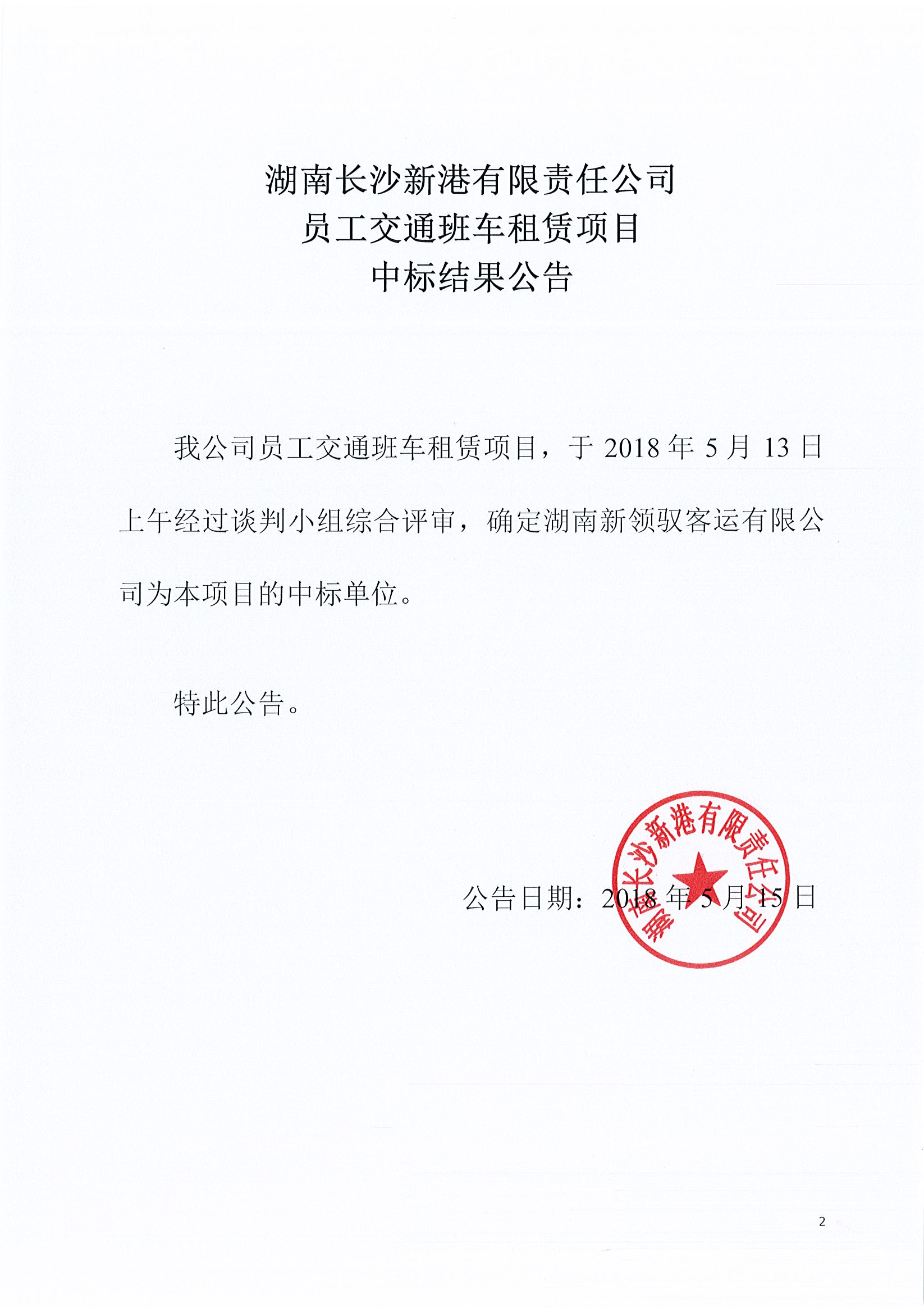 湖南長沙新港有限責任公司 員工交通班車租賃項目中標結果公告