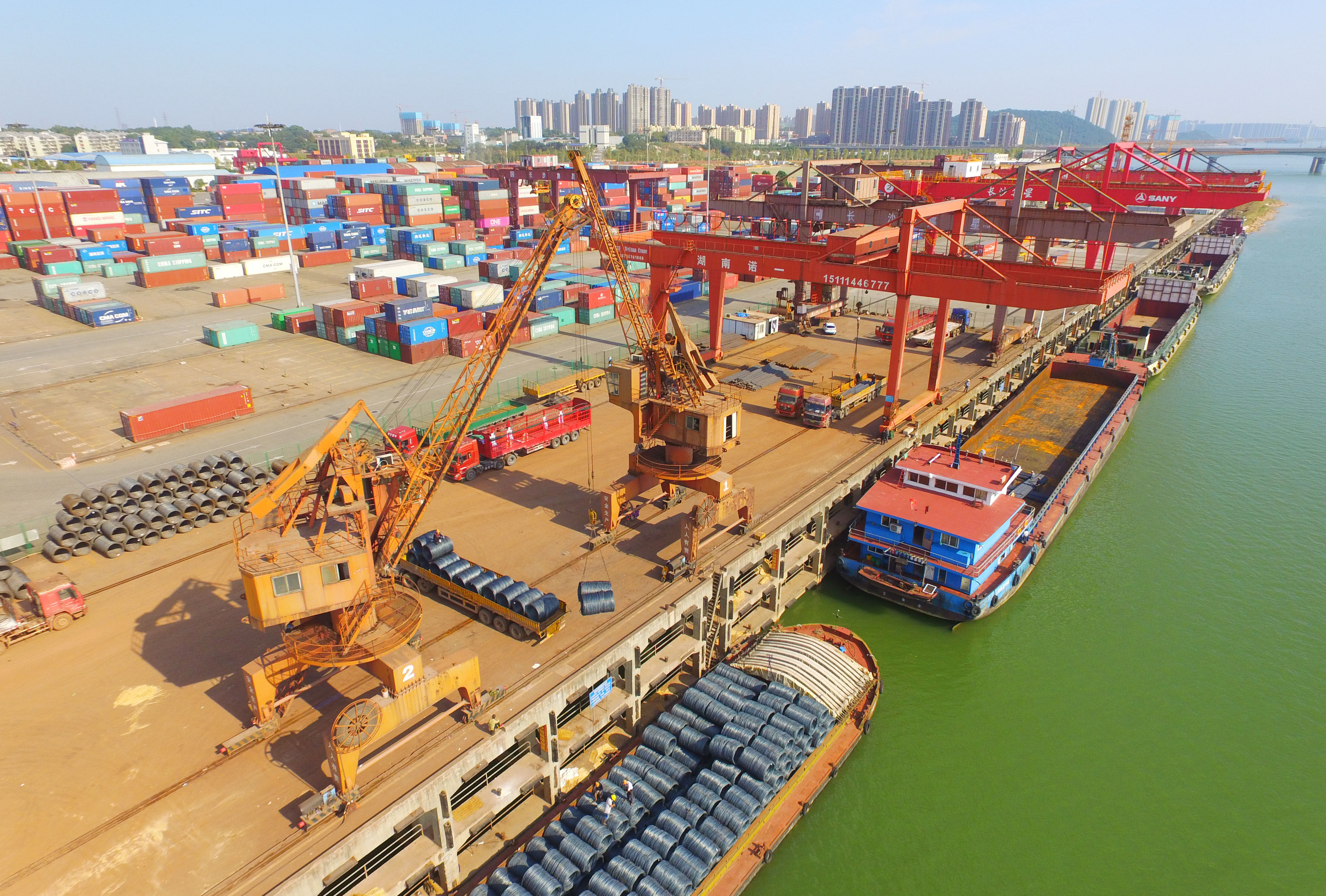 在長沙新港,裝船機上下揮舞臂膀,大型集裝箱鱗次櫛比,岸上吊車來回穿梭,一片繁忙景象。
