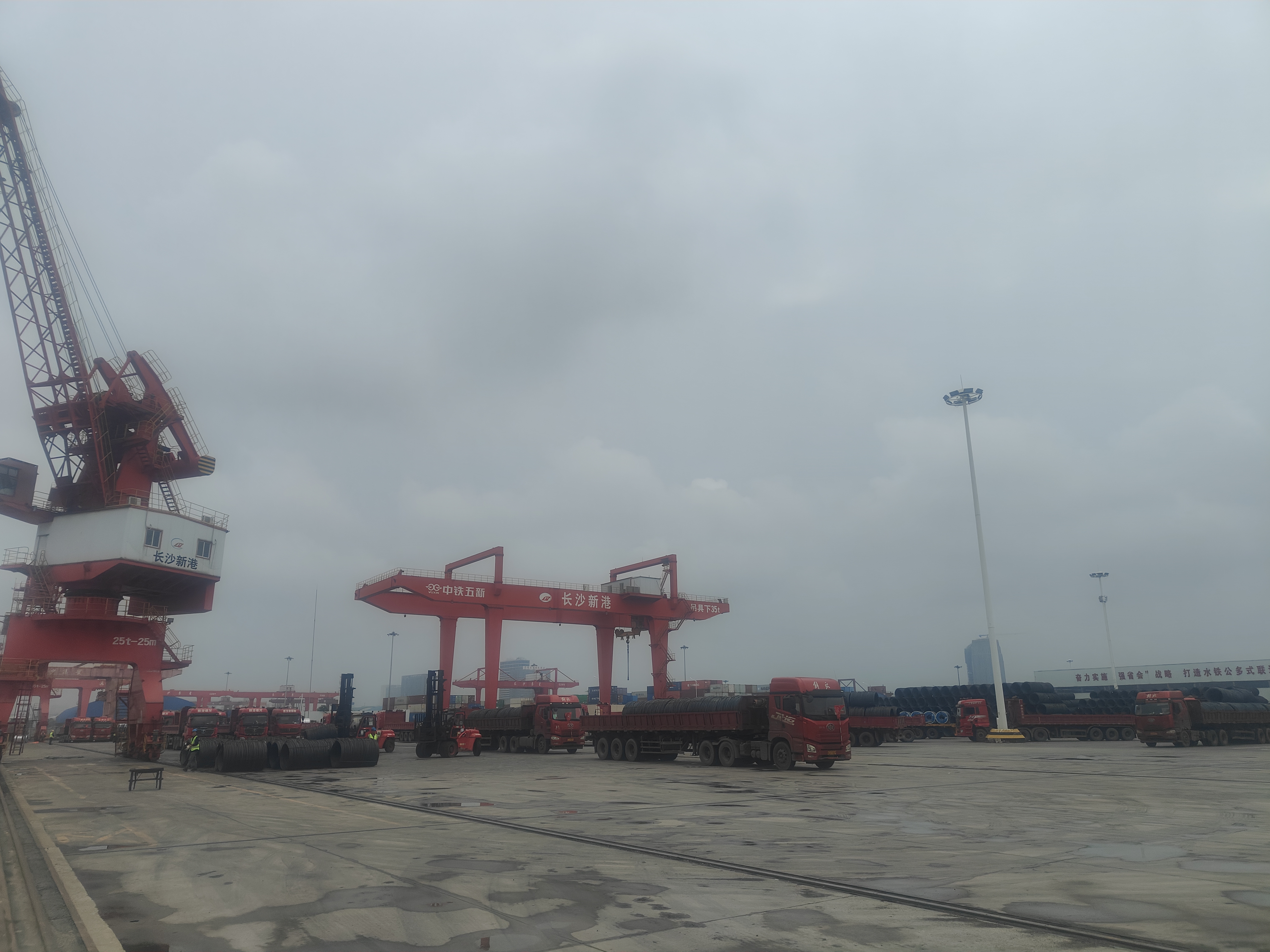圖為“五一”期間,長沙新港港區(qū)對貨物進行集港作業(yè)