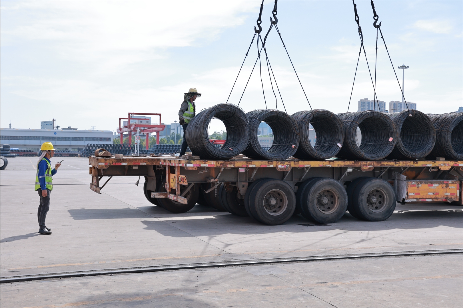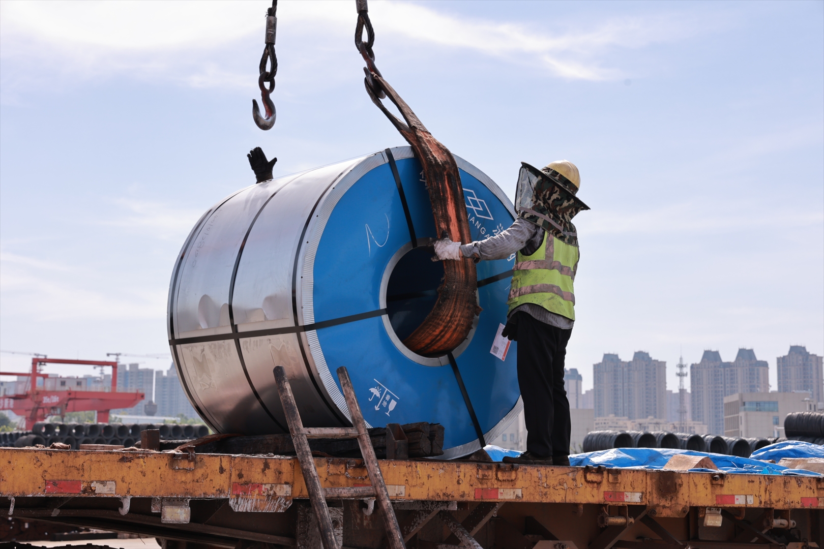 目前長沙進入持續高溫季節,面對復雜嚴峻的安全生產形勢,城陵磯港口集團長沙新港公司戰高溫趕生產,一邊優化生產調配、投入防暑降溫措施,在繁忙的港區里奏響著“勞動者之歌”。 烈日下,一臺臺吊車有條不紊地運作,來往的貨車絡繹不絕,貨物井然有序地擺放在相關區域,等待裝船下河。這幾天,集中鐵水聯運漣鋼工業鋼材裝船,萍鋼盤螺公水聯運裝船,平均每日鋼材作業6000噸。 早在入伏前夕,公司提前研判,預備防暑物資,做好高溫生產準備。管理部室輪流開展“送清涼”活動,每日為生產一線送去綠豆粥、涼茶、西瓜;通過科學安排生產計劃,合理開設“早間班”“零點班”,避開高溫時段,減少貨船與貨車的侯港時間,保障整個生產流程安全高效,進一步夯實長株潭地區鐵水聯運高質量發展,為服務區域經濟貢獻長沙新港力量。  長沙新港公司生產運營部裝卸班班長鄒遠華在烈日下正在組織裝卸班組轉運冷卷版鋼材。