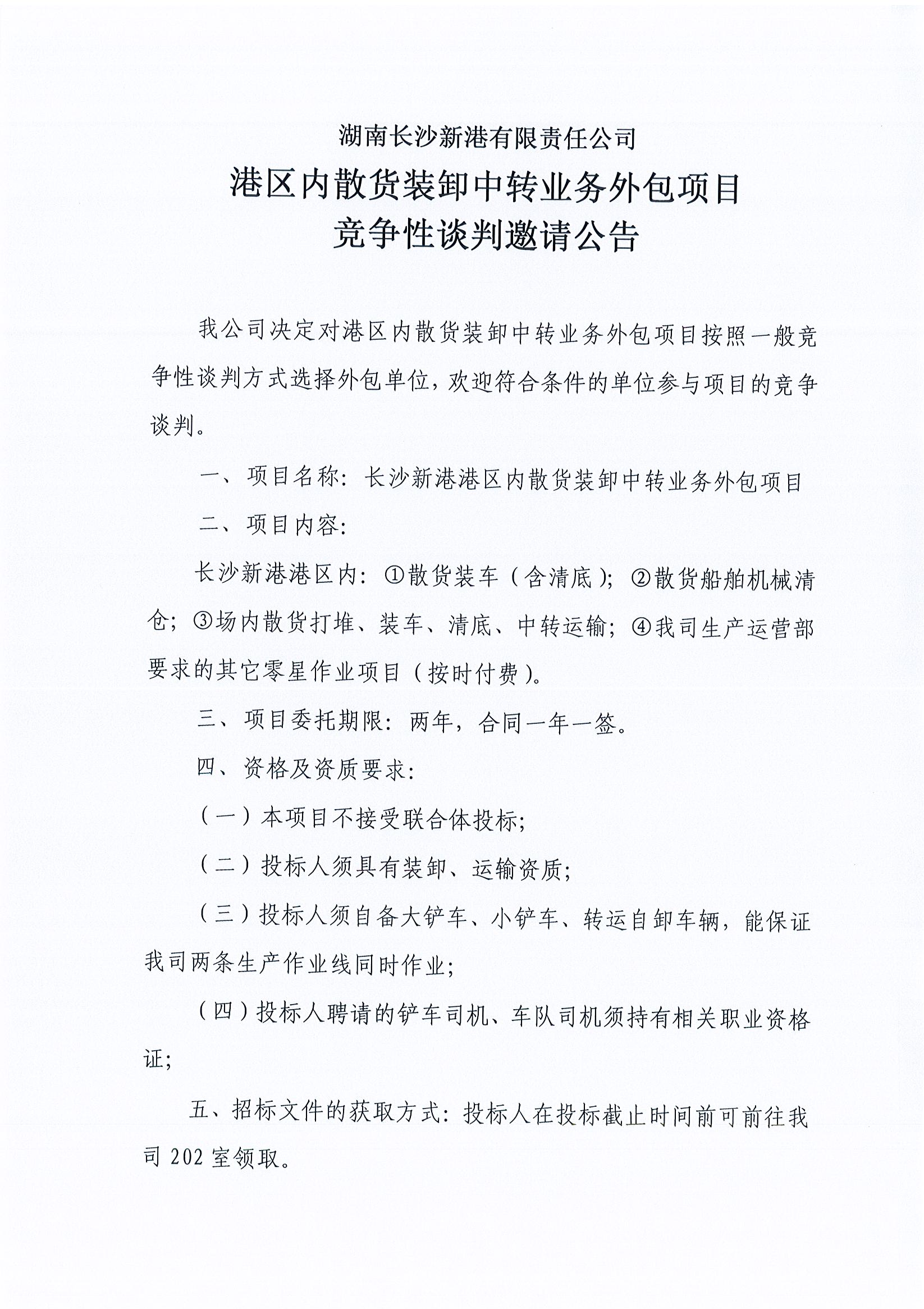 湖南長沙新港有限責任公司港區內散貨裝卸中轉業務外包項目競爭性談判邀請公告