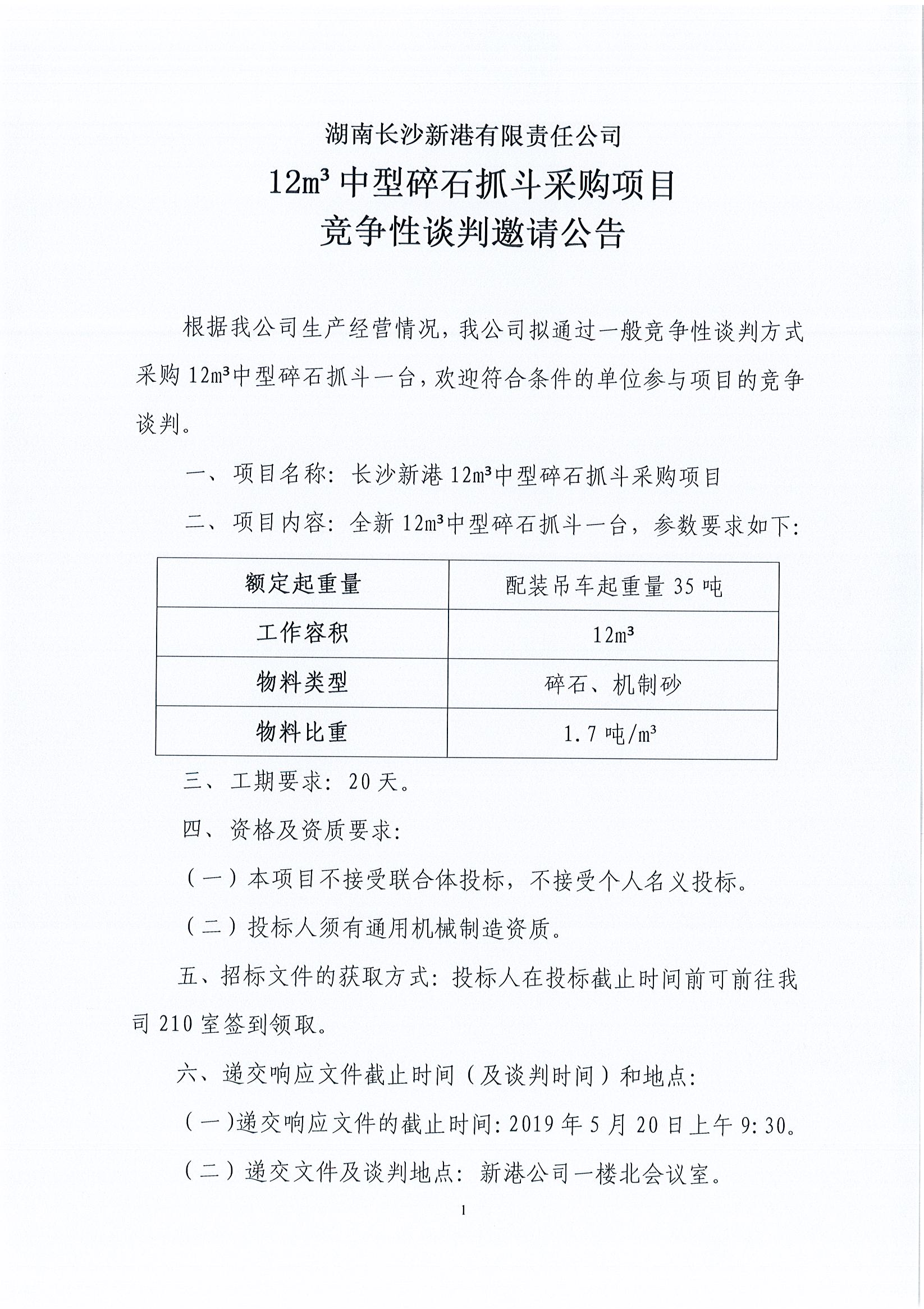 湖南長沙新港有限責任公司12m³中型碎石抓斗采購項目競爭性談判邀請公告