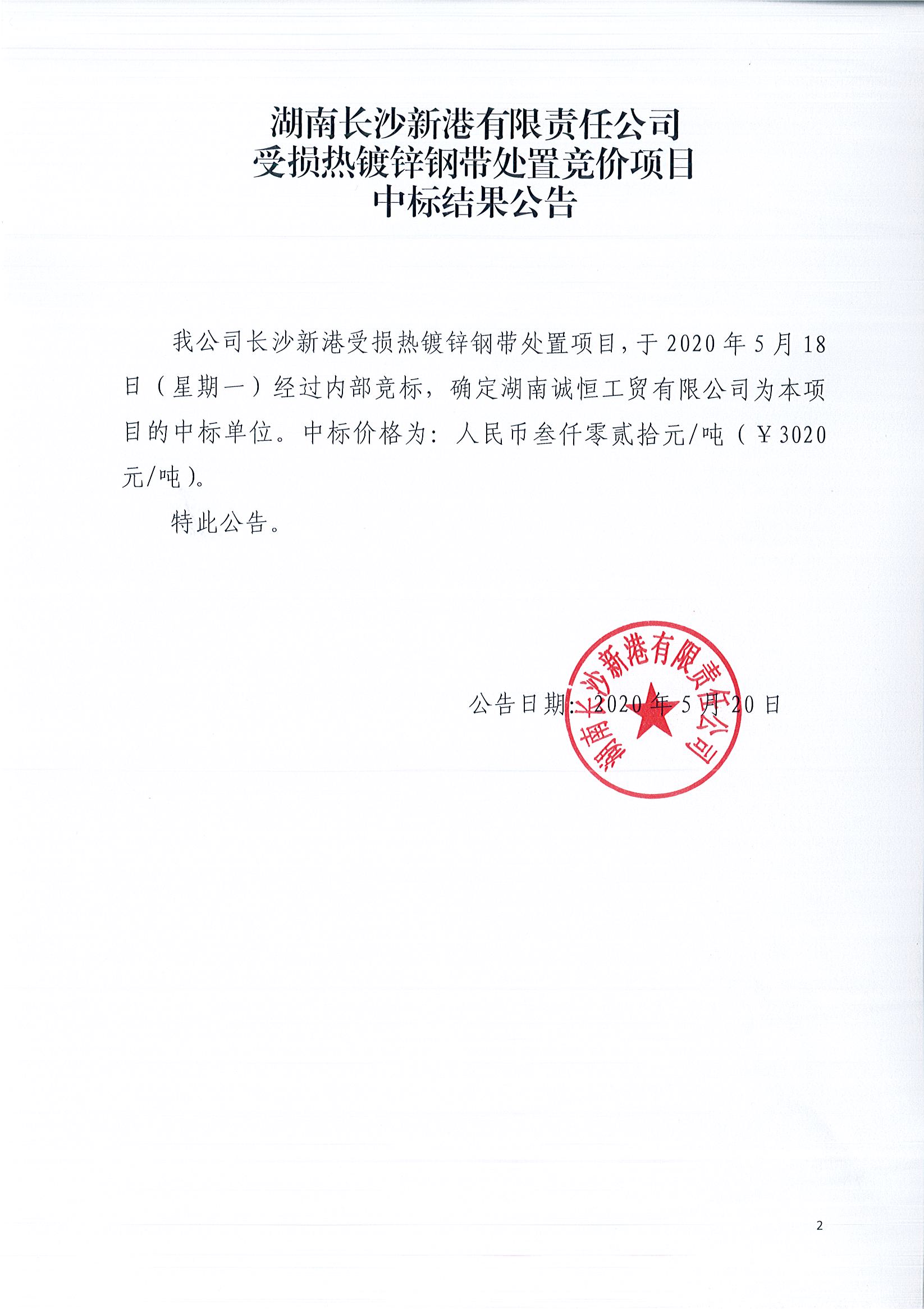 湖南長沙新港有限責任公司受損熱鍍鋅鋼帶處置競價項目中標結果公告