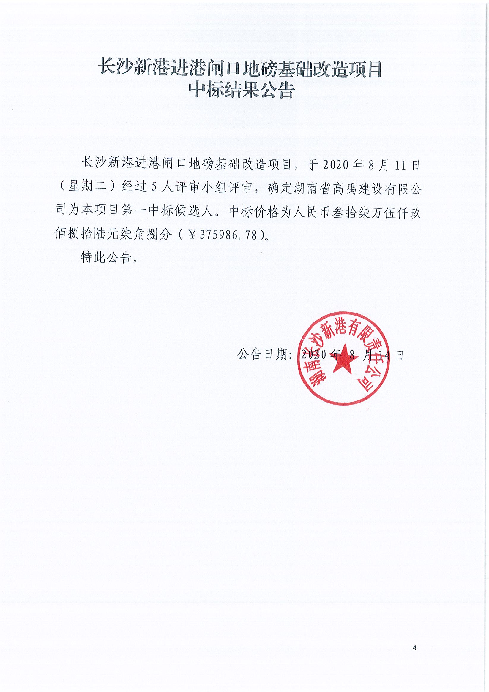 長沙新港進港閘口地磅基礎(chǔ)改造項目中標(biāo)結(jié)果公告