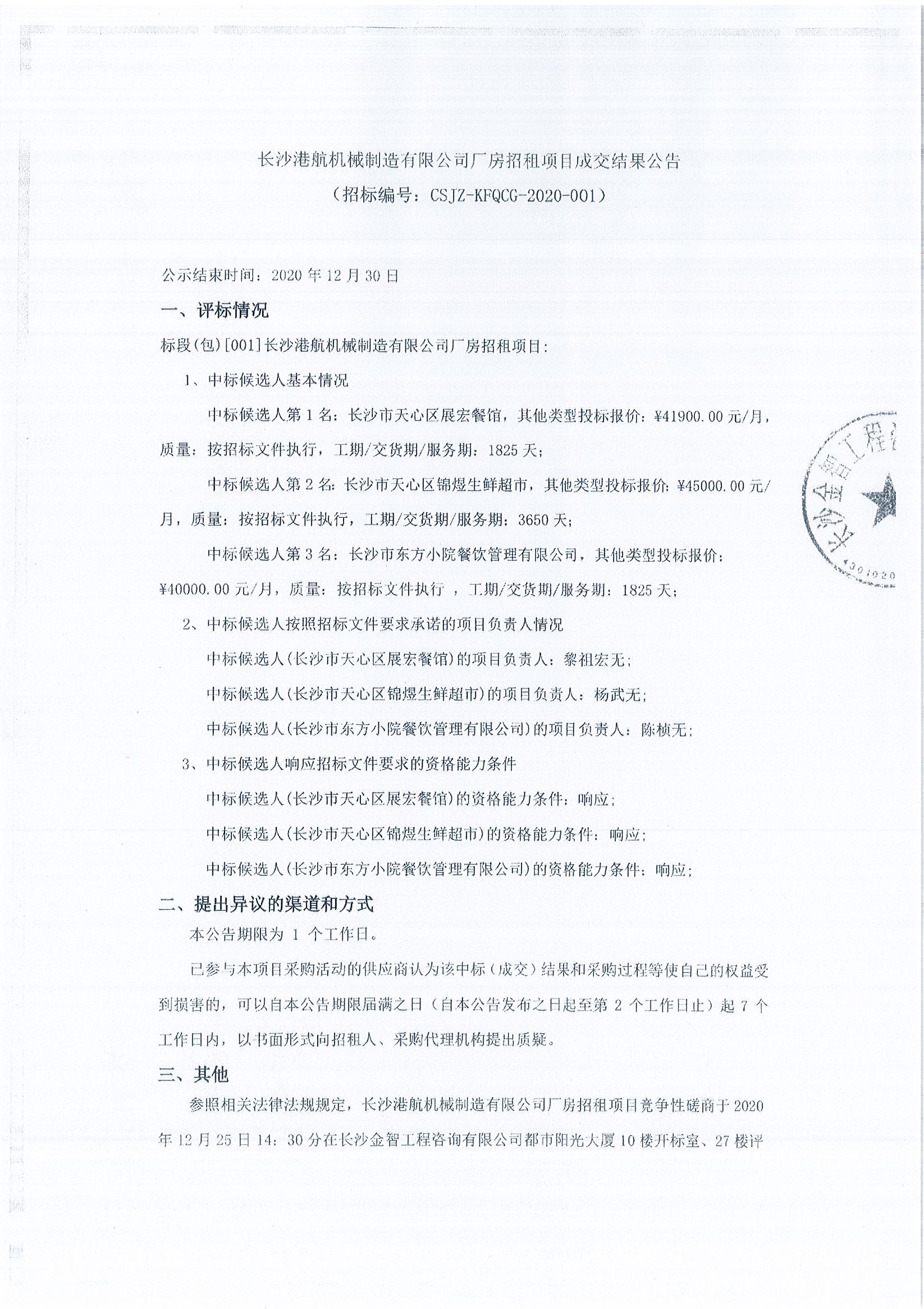 長沙港航機械制造有限公司廠房招租項目成交結果公告