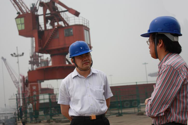 深圳市鹽田港集團(tuán)有限公司副總經(jīng)理徐云國(左一)在碼頭上與長沙新港有限責(zé)任公司副總經(jīng)理張韜(左二)就港口發(fā)展進(jìn)行交流。