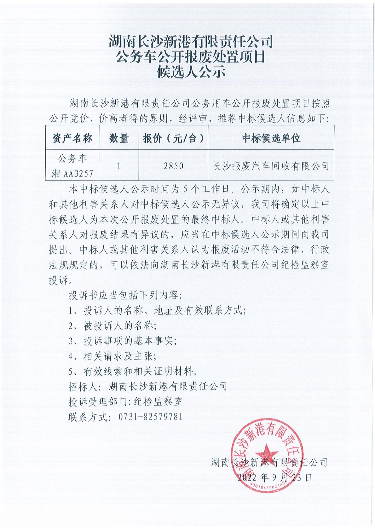 湖南長沙新港有限責任公司公務車公開報廢處置項目候選人公示