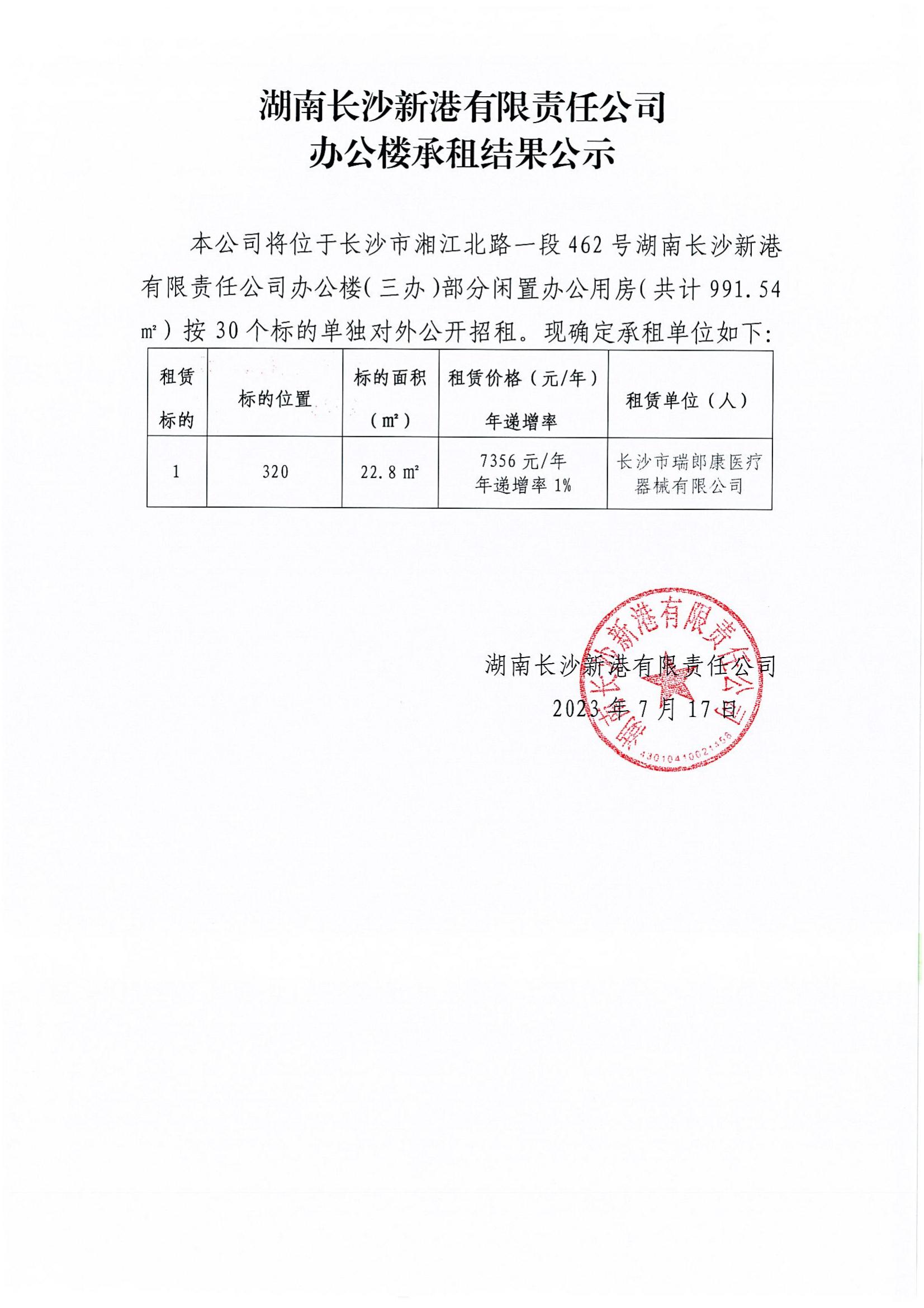 湖南長沙新港有限責任公司辦公樓承租結果公示(320)