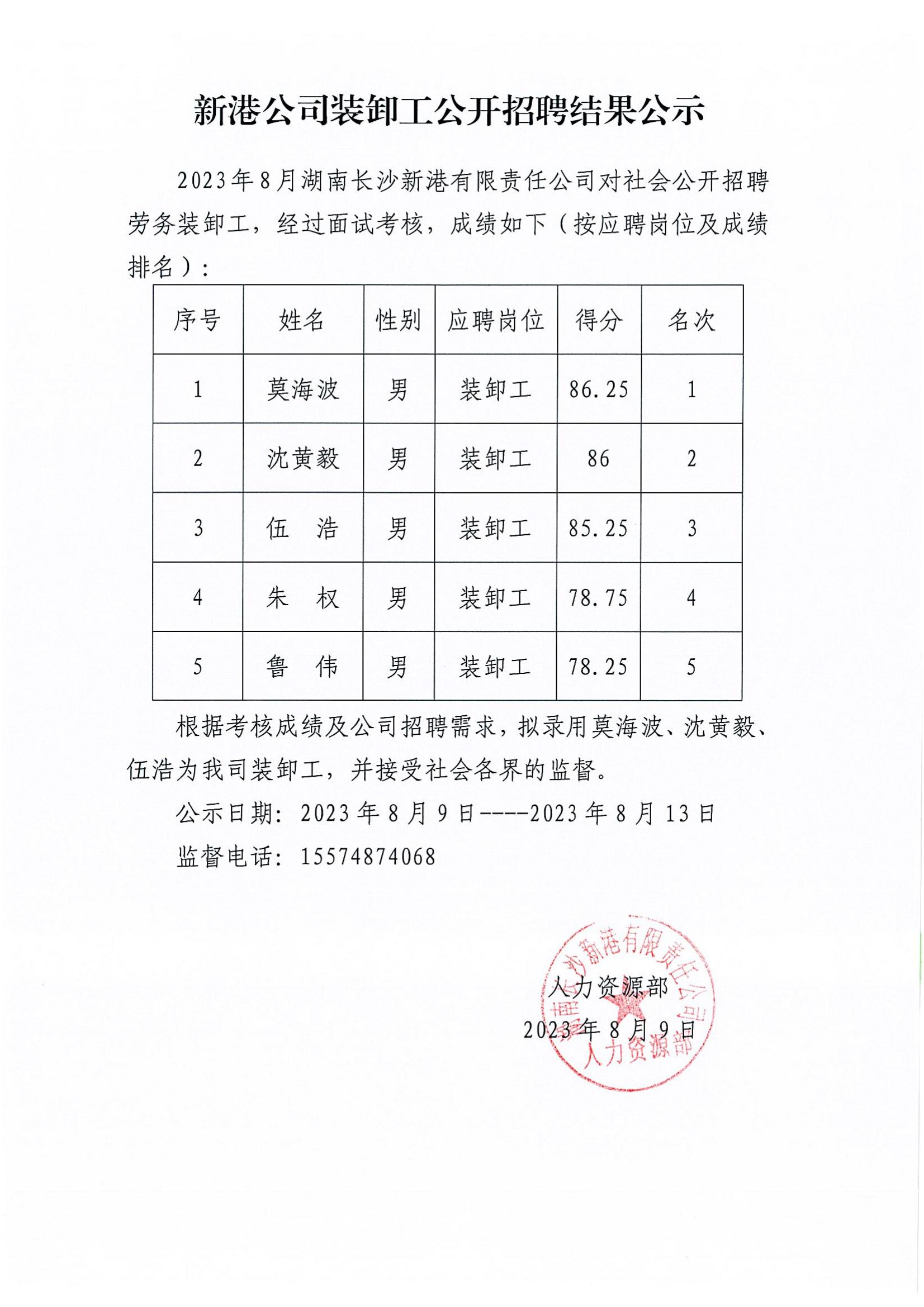 新港公司裝卸工公開招聘結果公示