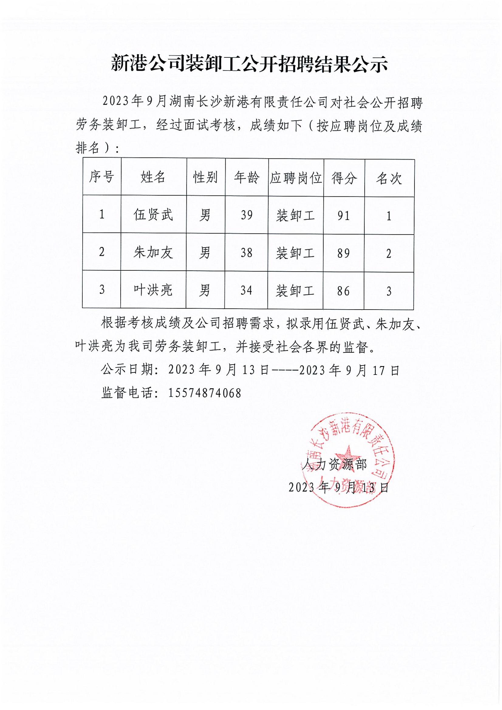 新港公司裝卸工公開招聘結果公示