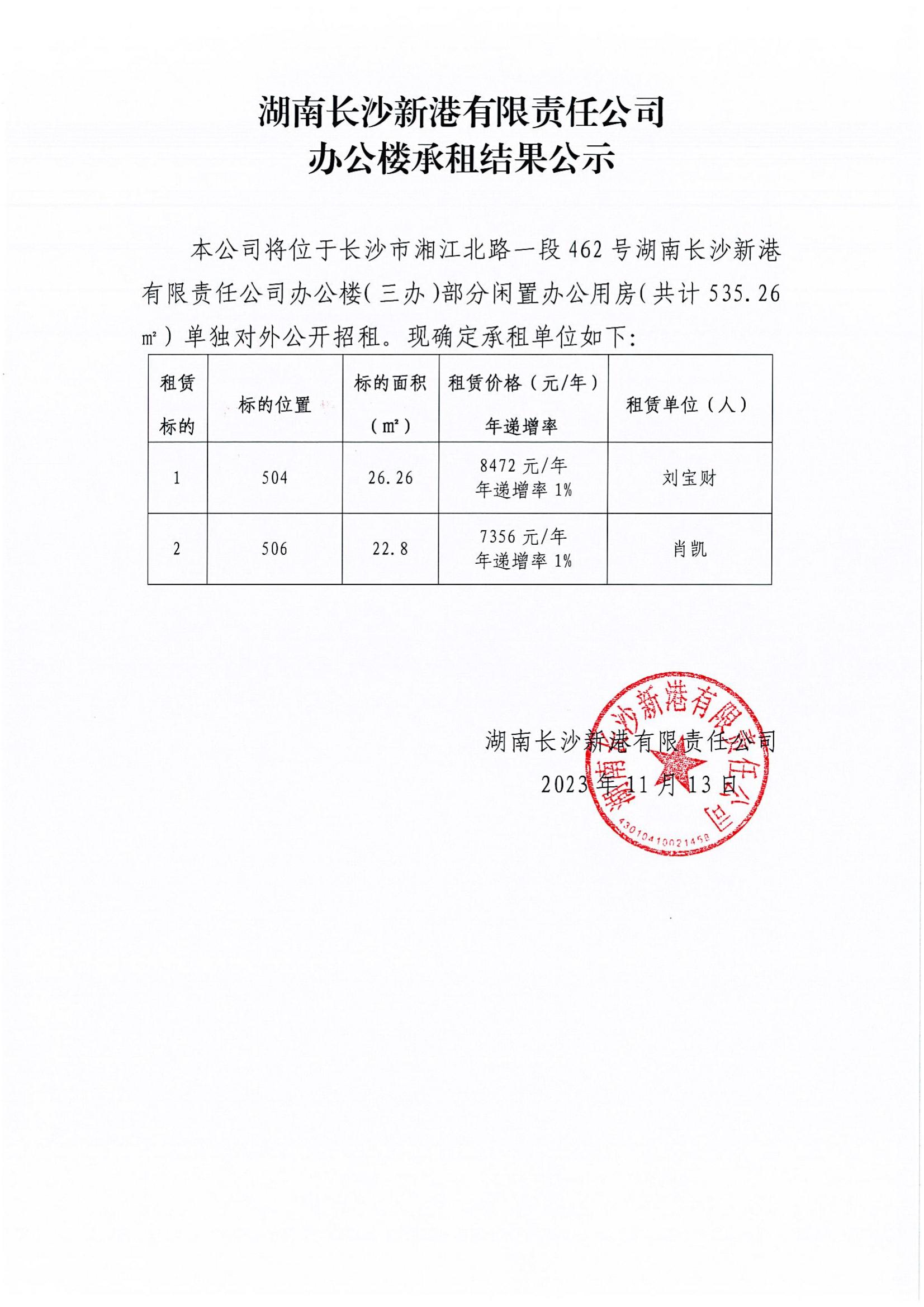 湖南長沙新港有限責任公司辦公樓承租結果公示