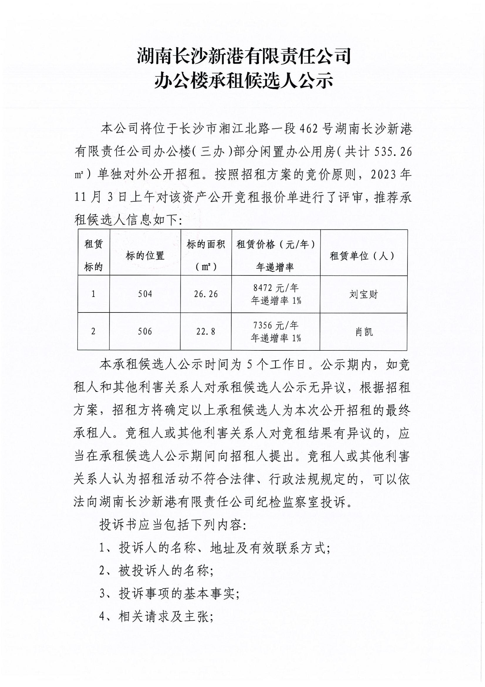 湖南長(zhǎng)沙新港有限責(zé)任公司辦公樓承租候選人公示