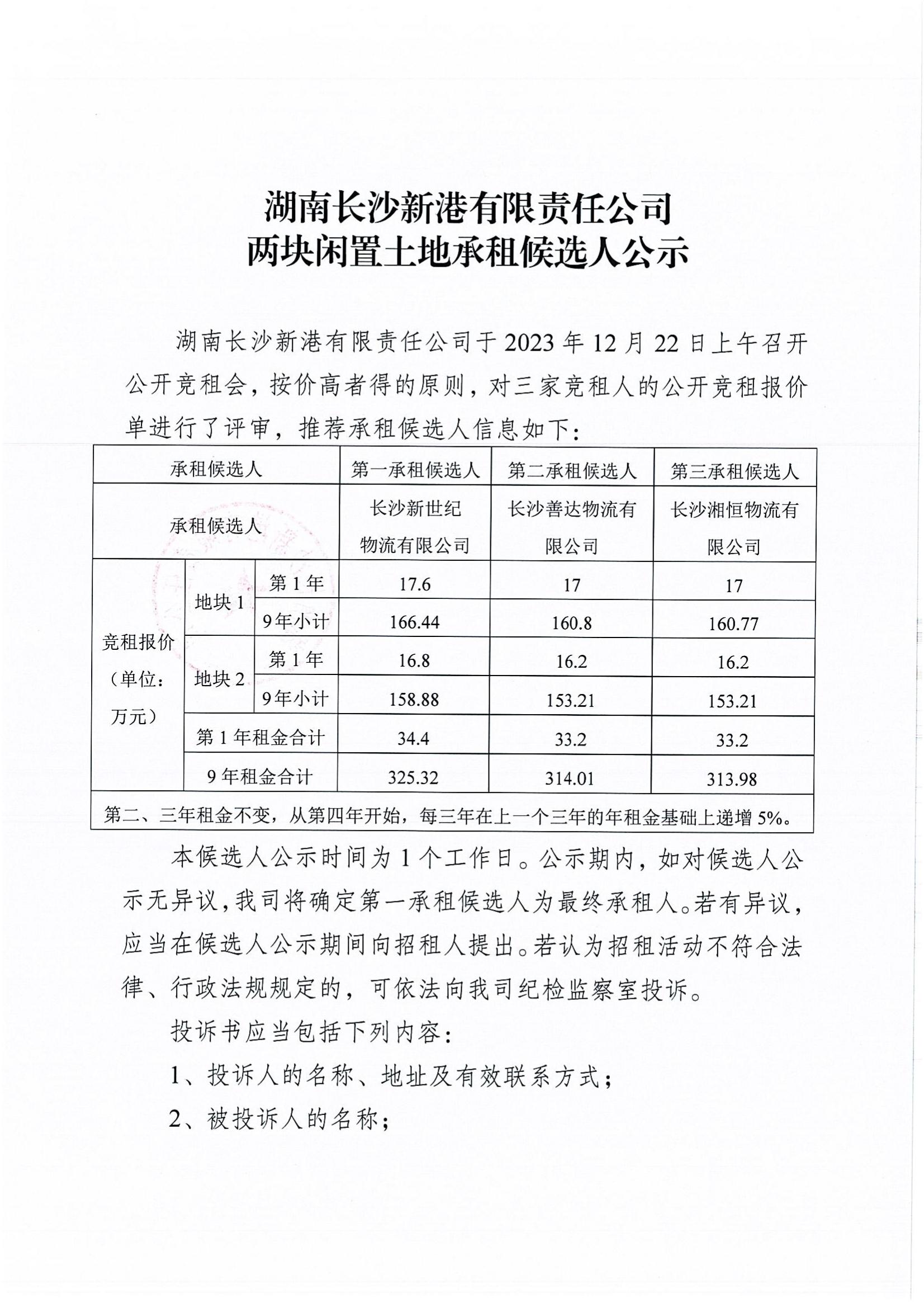 湖南長(zhǎng)沙新港有限責(zé)任公司兩塊閑置土地承租候選人公示