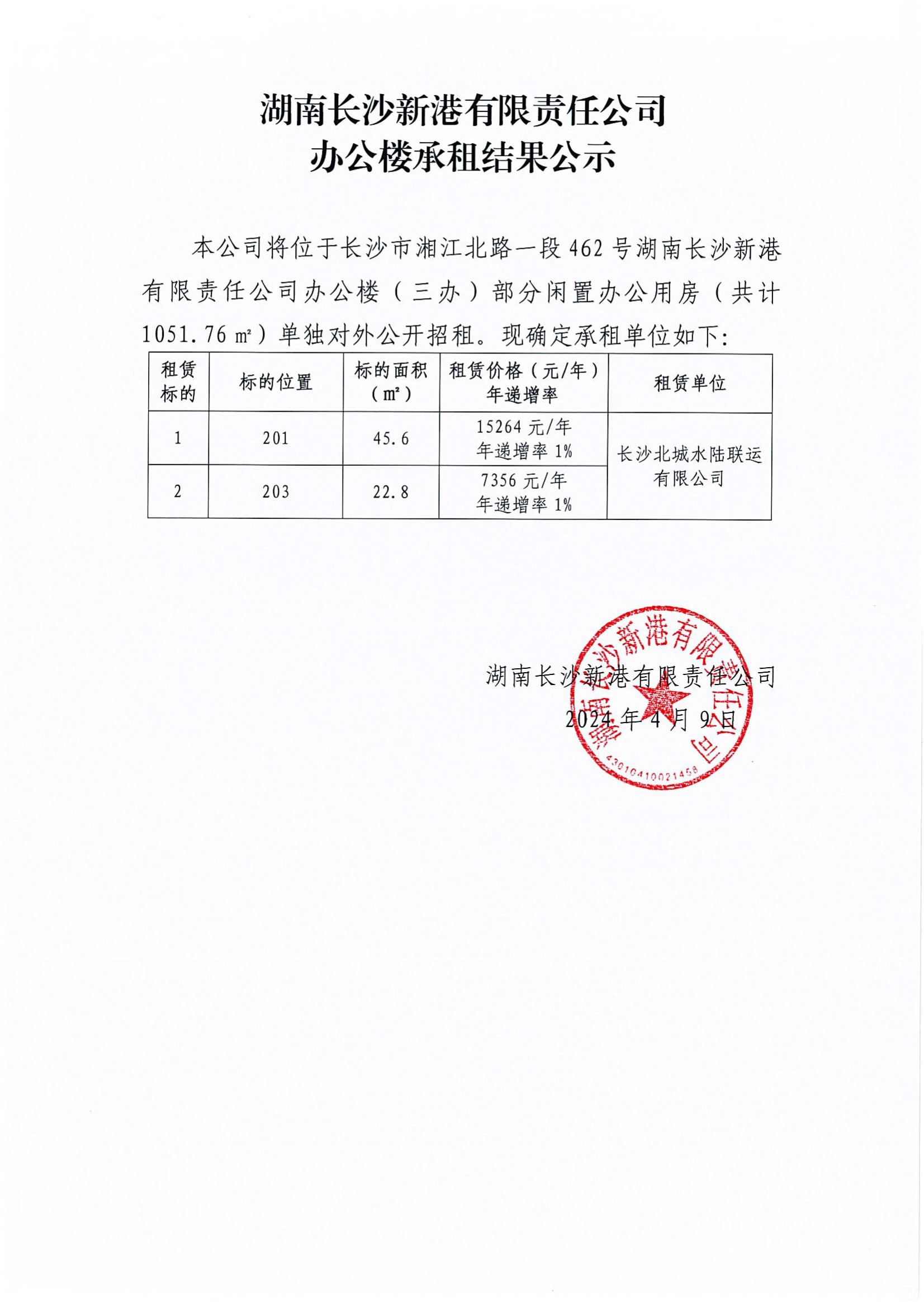 湖南長沙新港有限責任公司辦公樓承租結果公示