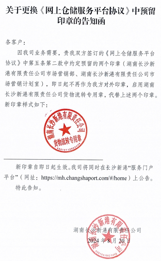 關于更換《倉儲合同》《網上倉儲服務平臺協議》中預留印章的告知函